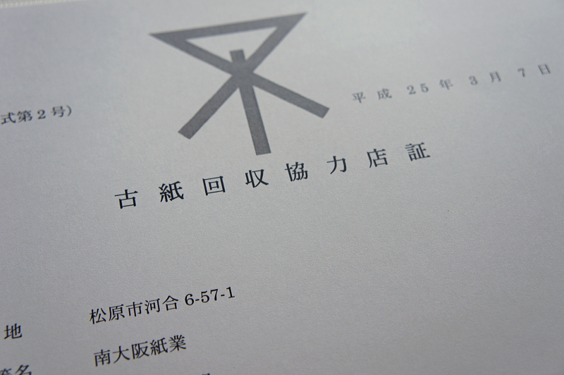 南大阪紙業でも大阪市のごみ減量に少しでも協力できればと言うことで「古紙回収協力店制度」に参加しました。事業所登録番号は【2012-35】です。